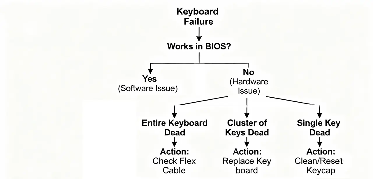 If the keyboard fails the BIOS test, you are dealing with a hardware issue. The failure pattern tells you exactly what to do next. Follow this decision tree: